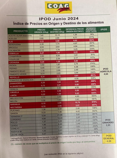 Un estudi de la COAG (Coordinadora d’Organitzacions d’Agricultors i Ramaders dels aliments) ha fet una radiografia a l’índex de preus entre el seu origen i la destinació durant el mes de juny. En aquest estudi es posa de manifest l’increment que experimenten fins a 34 productes alimentaris i on destaquen les pujades de productes com l’all un 502%, la ceba un 585%, la llimona un 845% o la taronja que arriba a aconseguir el 979%. En el cas de la ramaderia destaca la vedella que arriba al 297%.