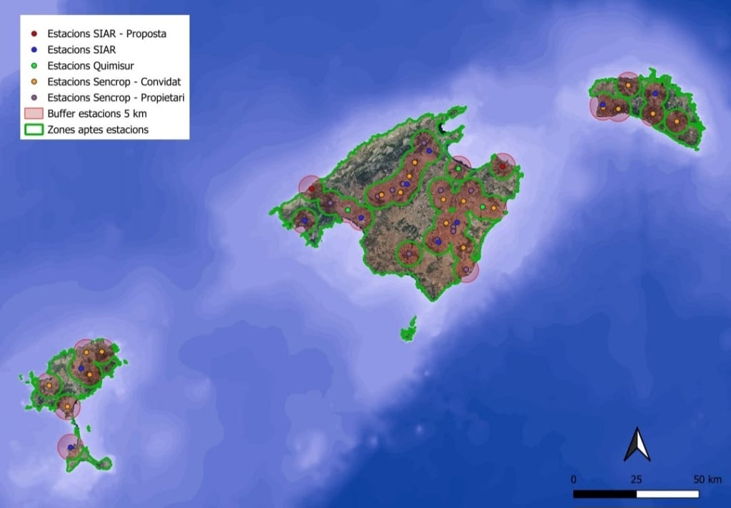 Actualment, les 16 estacions que formen part de la xarxa del Govern (SENCROP) cobreixen de manera efectiva de cinc quilòmetres entorn del lloc on estan ubicades. A més, aquestes es complementen amb les estacions del sistema d’informació climàtica del Ministeri d’Agricultura, Pesca i Alimentació (SIAR) i d’instal·lacions privades que comparteixen les dades de manera gratuïta (QUIMISUR). Les àrees que queden fora d’aquest abast s’identifiquen com a prioritàries per a futures instal·lacions.