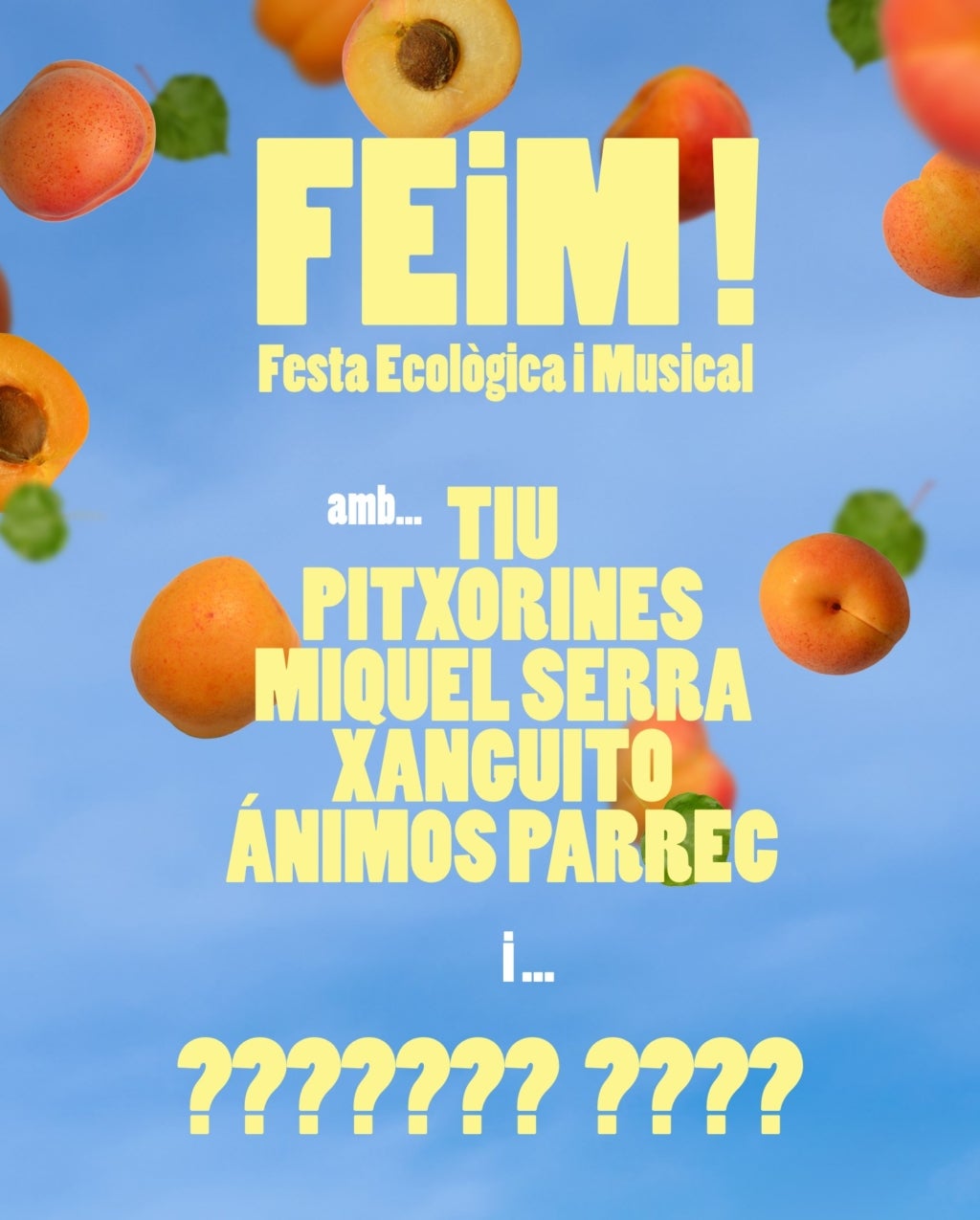 El pròxim dia 8 de juny, al parc de n’Hereveta de Porreres, es durà a terme la Festa Ecològica i Musical: FEiM! Una celebració dels aniversaris del CBPAE (Consell Balear de la Producció Agrària Ecològica) i d’APAEMA (l’Associació de la Producció Agrària Ecològica de Mallorca), que compleixen trenta i devuit anys respectivament. Tot i que no han volgut desvetlar el cap de cartell, ja han confirmat alguns artistes com: Pitxorines, Miquel Serra, i Xanguito, entre d’altres.