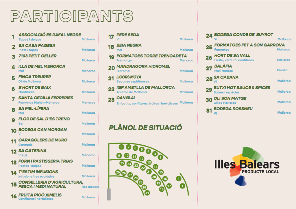 Entre els participants hi haurà cellers i productors de vi com Pere Seda, Bodegas Rossneu, Sa Cabana, Sa Catarina, 7103 Petit Celler, Bodega Can Morgan i Bodega Conde de Suyrot; productors d’oli com ara Finca Treurer, Oli Son Matge i Sa Caterina; formatgeries com Formatges Fet a Son Garrova, Formatges Torre Trencadeta i Santa Cecília Ferreries (Formatge Maó-Menorca), i productors de mel com Sa Mel·lífera, Beia Negra, Balàfia i Illa de Mel Menorca.