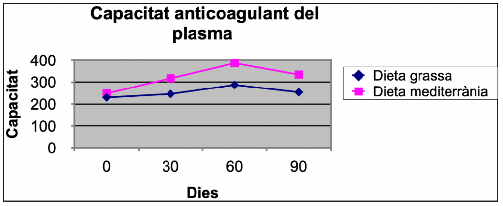 Entre els dies 60 i 90 en què es va retirar el suplement de la copa de vi es veu com baixen els valors dels factors anticoagulants. De manera que queda establert que per aquest conjunt de factors coagulants de la sang relacionats amb les malalties cardiovasculars, el vi té un efecte important en la protecció de l’organisme.