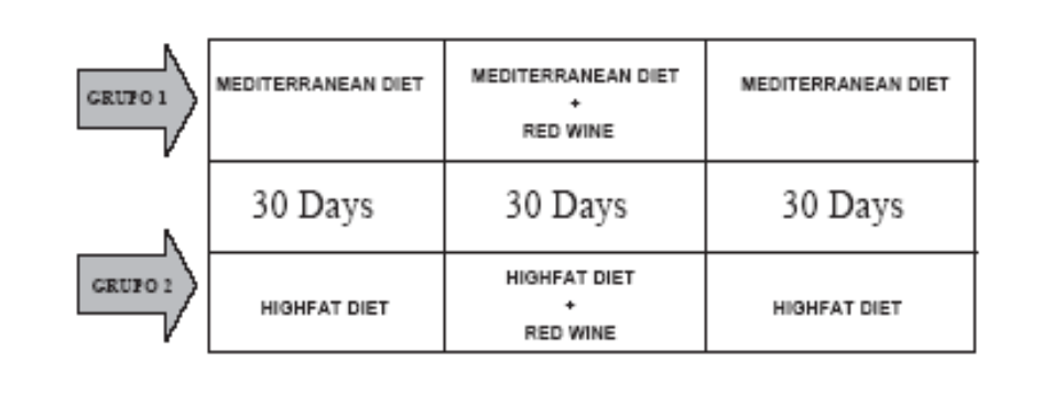Dos grups de vint persones es varen alimentar durant noranta dies amb una dieta d’alt contingut en greix i l’altre grup amb dieta mediterrània. Entre els dies 30 i 60 de l’experimentació la dieta es va suplementar en els dos casos amb 240 mL de vi, una copa per cada menjada.