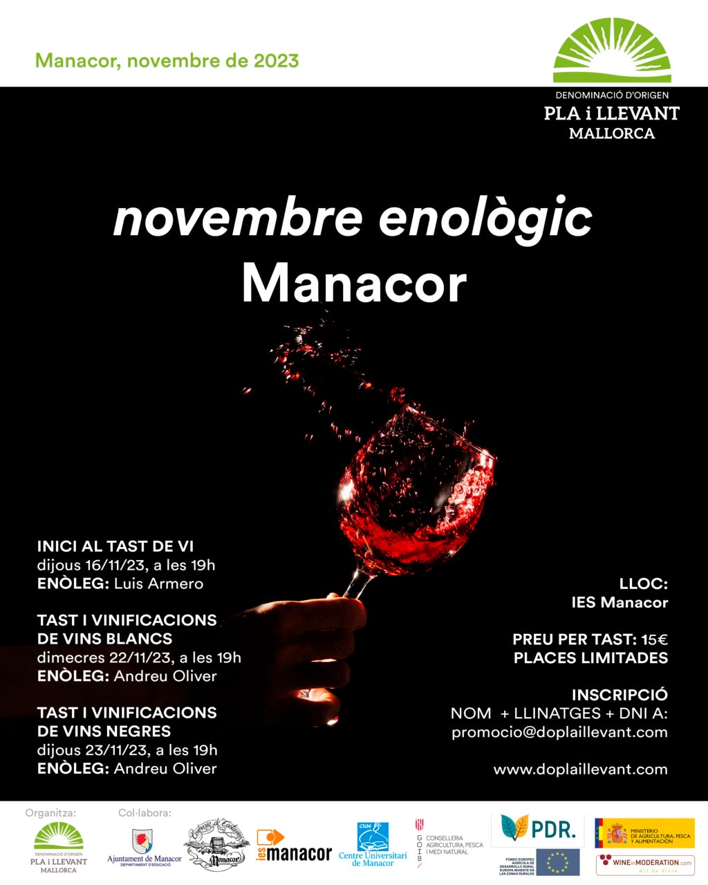 Tot és a punt per una nova edició del tradicional Novembre Enològic que la DO Pla i Llevant organitza a Manacor amb la col·laboració de l’Ajuntament de Manacor, el Centre Universitari, l’IES Manacor i la Confraria de Tastavins. Totes les activitats es duran a terme a l’IES Manacor, en el seu laboratori de Química.