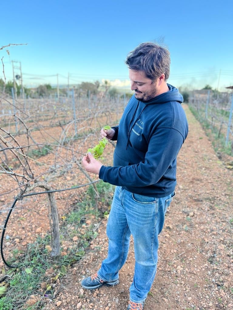 Sebastià Ordines, secreetari general d’UPM, mostra com la vinya està treguent brots nous com si fos primavera/UPM