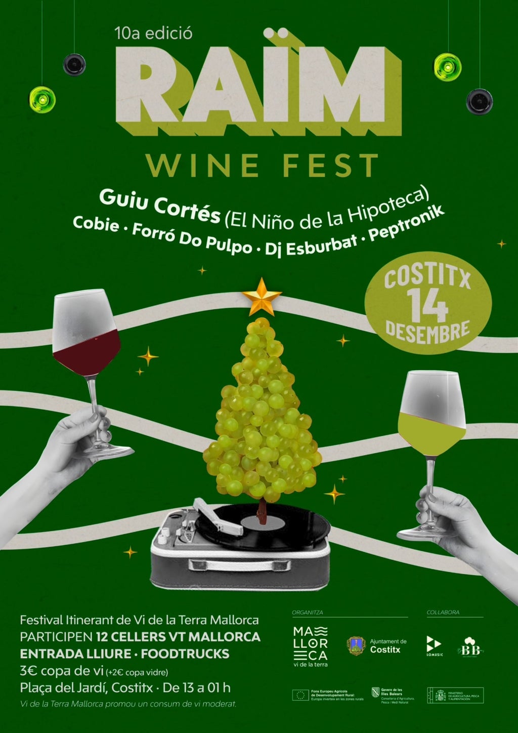 La IGP Vi de la Terra Mallorca ha convocat els seguidors del Raïm Wine Fest el pròxim dissabte, dia 14 de desembre, a Costitx. Costitx és el bressol del festival itinerant del vi organitzat des de VTM, que va néixer l’1 d’octubre de 2022, en aquest municipi del Pla de Mallorca i allà és justament un se celebrarà la desena edició. Aquesta vegada, pocs dies abans de les festes de Nadal, obrirà les portes a les 13 hores fins a la una de la matinada a la plaça del Jardí i serà l’escenari ideal perquè la IGP Vi de la Terra Mallorca presenti la campanya de Nadal, protagonitzada pels mateixos cellers que en formen part.