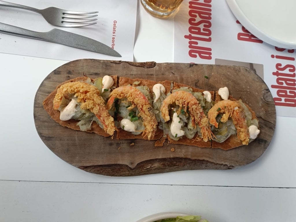 Així mateix, la carta està farcida de propostes culinàries apetitoses entre les quals en triam algunes entre els suggeriments del xef, com per exemple la coca de bulb de fonoll amb gambeta fregida, que es desfà a la boca de tendra, amb el sabor suau que aporta el bulb de fonoll. També demanam, per obrir boca, la coca de pebres vermells torrats i xulla cruixent i una amanida de ventresca de tonyina i vinagreta de pinyons.