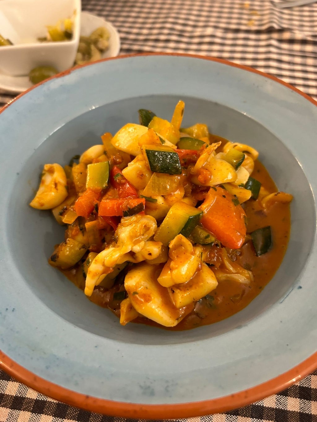 La sípia amb sobrassada segueix la línia de la llengua i és un plat en el qual destaca la suavitat de la carn de la sípia i la bona qualitat de la sobrassada que l’acompanya. Les albergínies farcides presenten una variació vegetal de l’hort que pot ser molt del gust dels vegetarians, així com les sopes escaldades amb verdura d’hivern. Com a plats de carn i de peix, les costelles de xot amb acompanyament de patates i pebres vermells fregits i l’orada a la planxa amb ensalada, un plat lleuger per acabar l’àpat. Les postres són casolanes i es nota. Bon flam i una poma al forn remarcable.