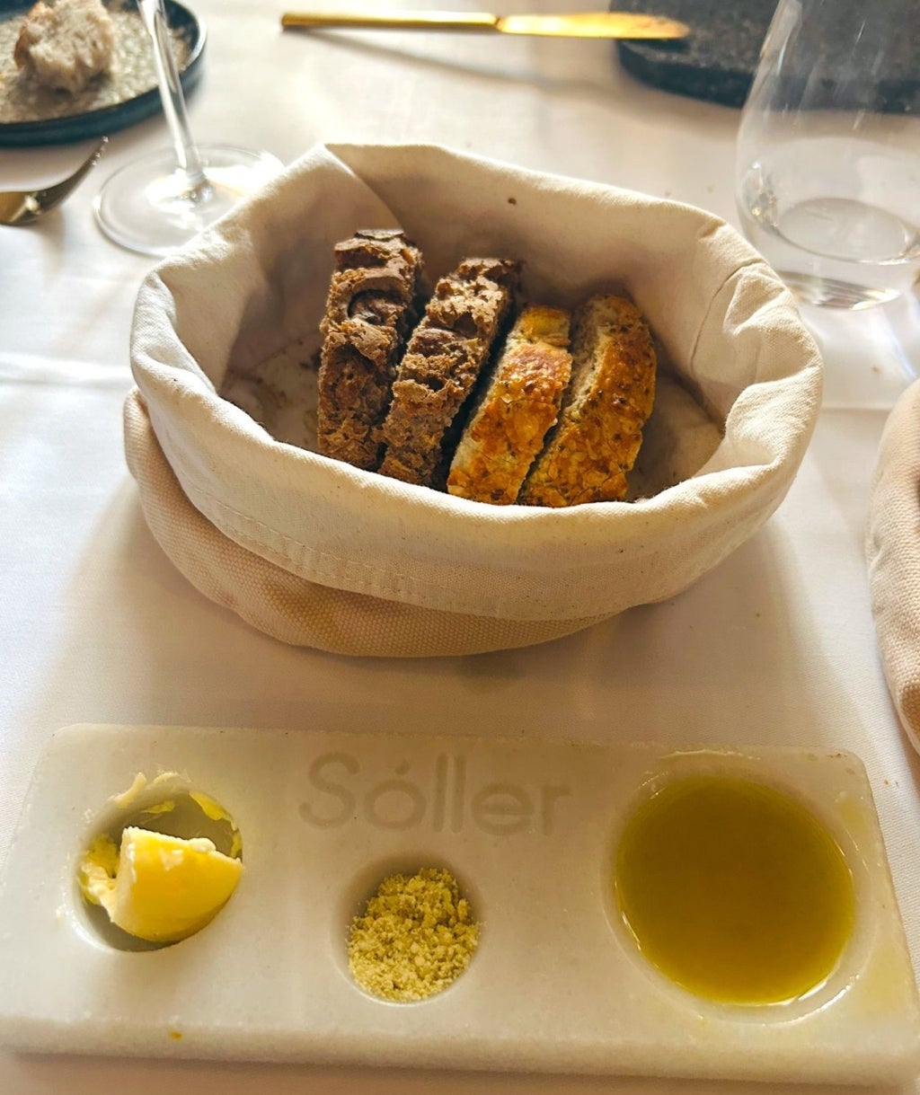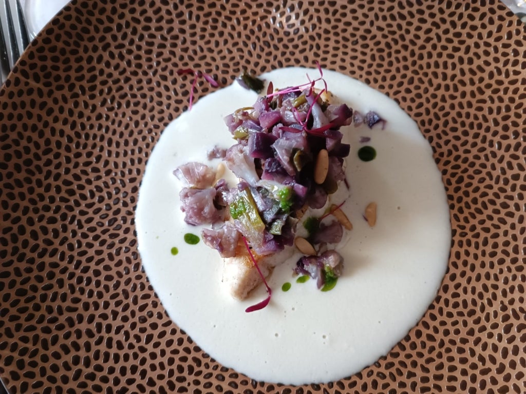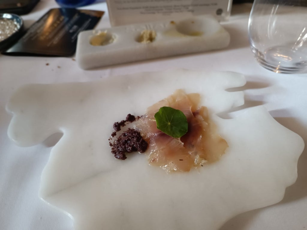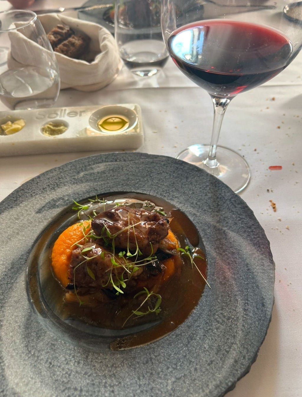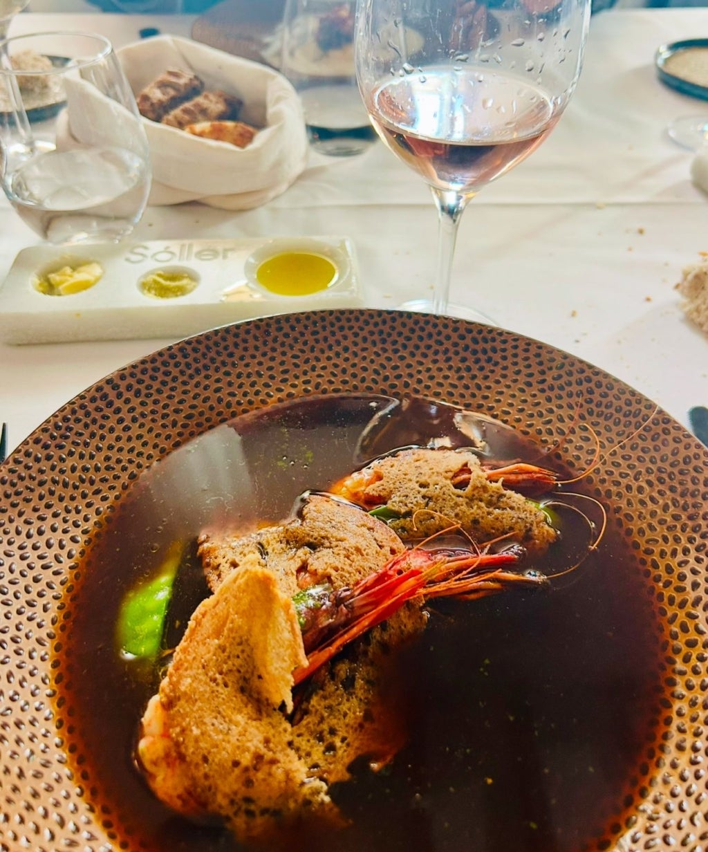 I, finalment ens podem posar a taula per considerar l’àpat de què vàrem gaudir en el restaurant en aquest mes de desembre: aperitius, un primer plat de Suquet de gamba de Sóller amb picornells, després a escollir entre Negret del Mediterrani amb veloutté de chardonnay o Caldereta de gamba de Sóller. Kiko Martorell posa com a exemple de producte de qualitat el negret, un peix que abans era poc apreciat i ara està de moda. Explica, però, que moltes vegades el que es posa als plats procedeix de l’oceà que té una qualitat bastant inferior al del Mediterrani.