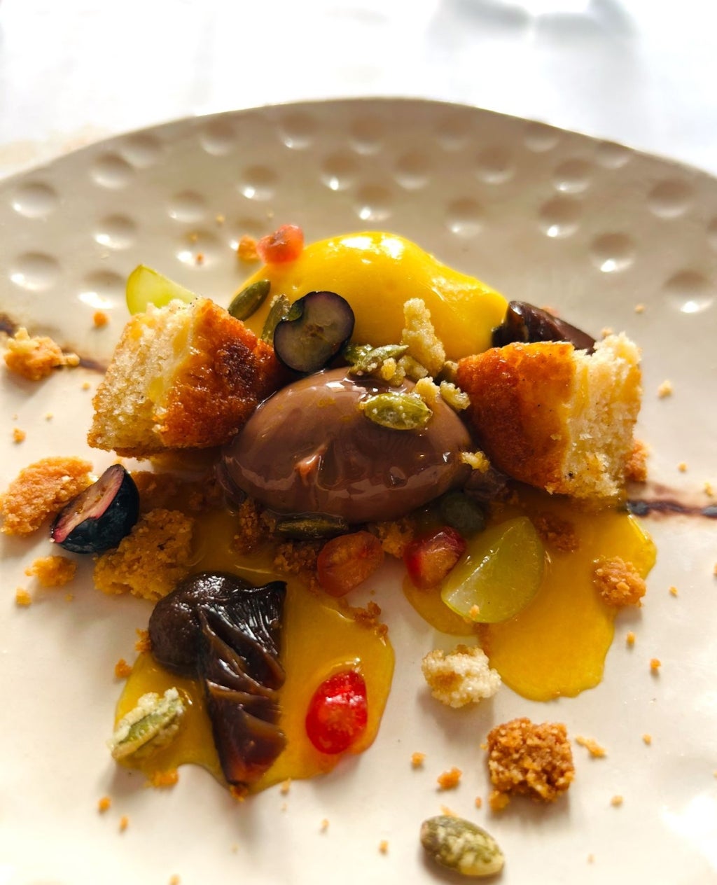 Acaba el dinar amb un sorprenent esclata-sang confitat, xocolata, gató, gelats i fruita d’hivern.