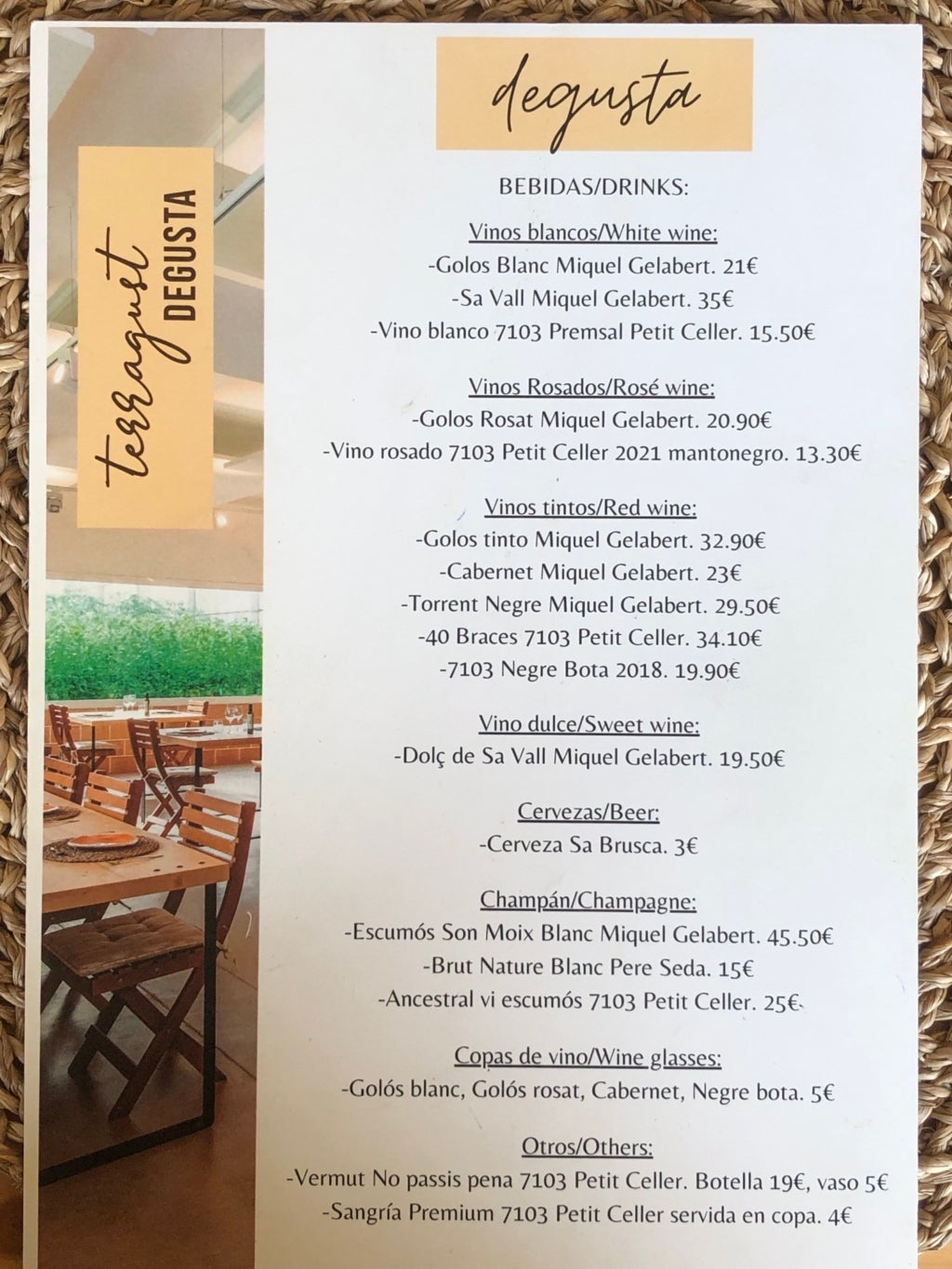 Un comentari especial mereix la carta de vins. Acostumats com estam a la presència de vins de Mallorca a les cartes dels restaurants amb totes les notables excepcions que s’han de fer és un gust veure en un restaurant una carta en la qual tots els vins són de la terra, de diversos cellers i de les diverses marques de qualitat. I els preus als quals s’ofereixen és més baix que els vins peninsulars de similar qualitat. Això dels preus dels vins de Mallorca és un mite a batre.