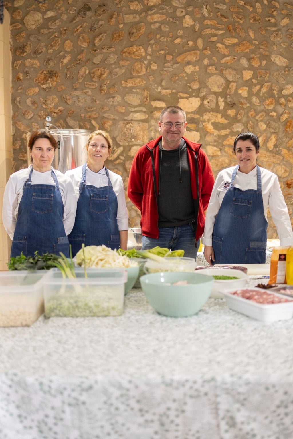 En bon dissabte dematí, i després de fer una classe magistral sobre com fer i perquè la poda de la vinya, a càrrec de Toni Martí, arribarem al celler, escenari de l’activitat. Una dotzena de participants en el taller esperen les instruccions precises de la mestressa de cerimònies, Maria Antònia García. Maria Antònia dur a la sang tot el cerimonial que acompanya la festa, des de l’espinagada a la ximbomba i a la cançoneta santantoniera, com demostrarà al llarg de la jornada. Però, i això és molt important, les ganes de compartir els secrets de com fer aquesta coca tapada, segons tots els canons poblers. L’assistien altres dues companyes cuineres, na Cati Pons i na Reyes Morales.