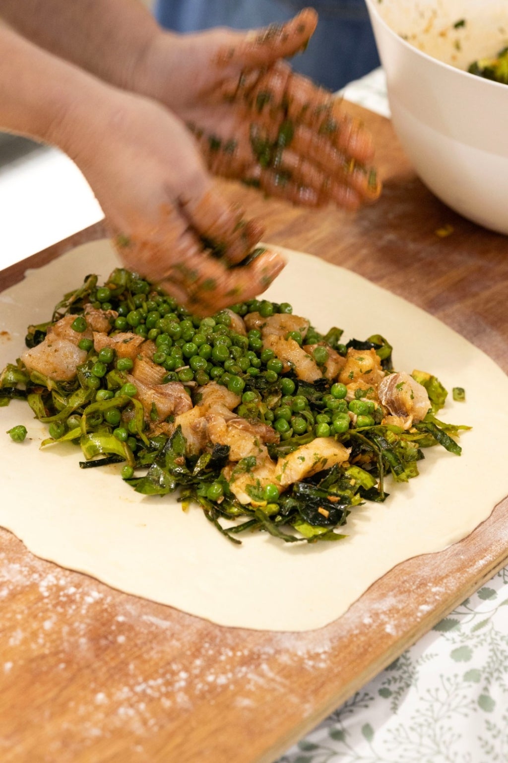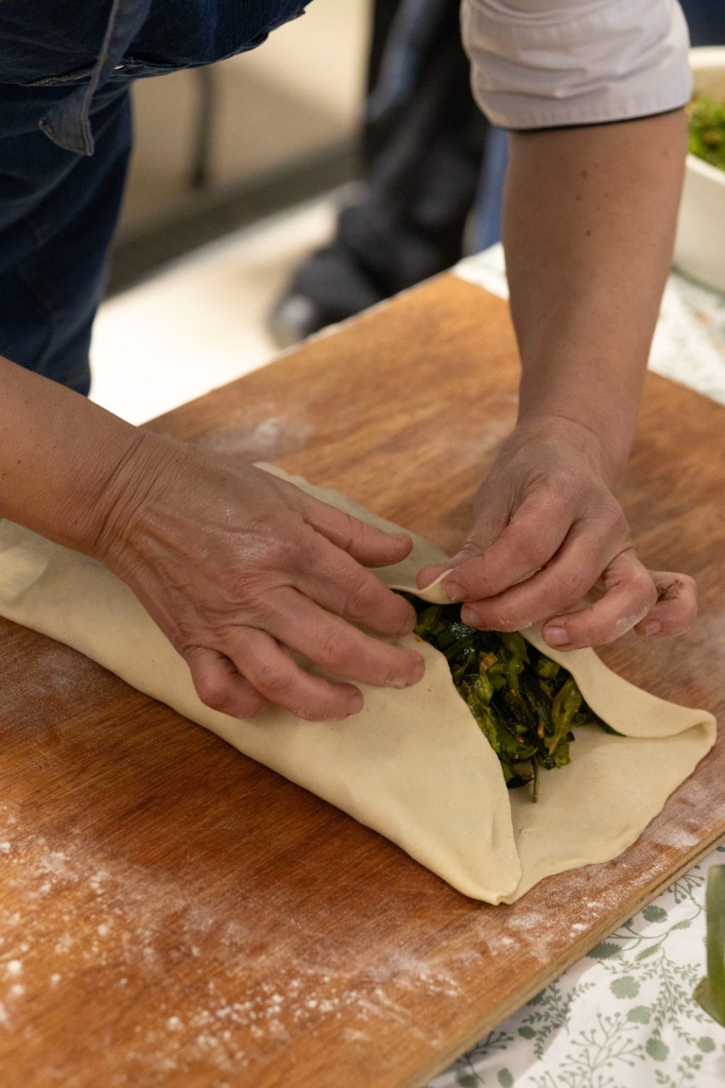 Per preparar la pasta també té el seu secret, que comença per posar els ingredients en la justa proporció: farina, saïm (oli pels que no van de carn ni de porc), i aigua. Gens de sal!!!, remarquen les cuineres: Sal, no! I s’ha de deixar reposar un poc, abans de poder-la estirar amb l’aprimador… És important que quedi ben estirada i prima perquè l’espinagada quedi com ha de quedar de bona.