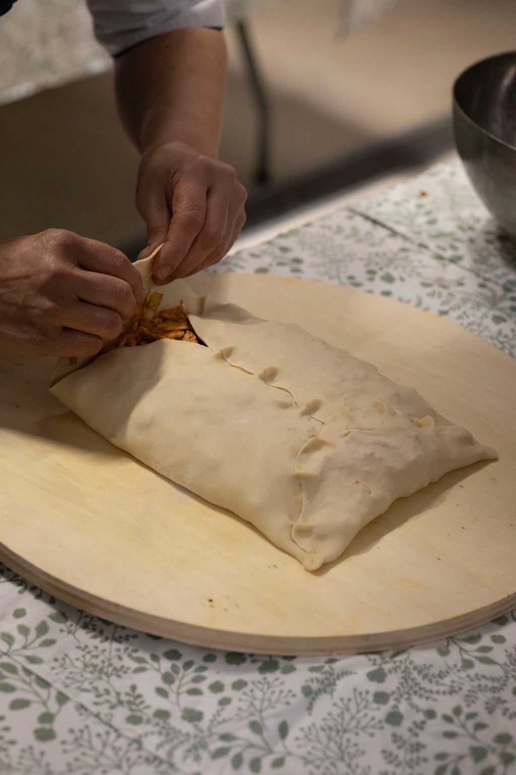 En haver posat el farciment, s’ha de tancar mirant que quedi ben tapada i després s’ha de dur al forn on estarà fins que estigui cuita.