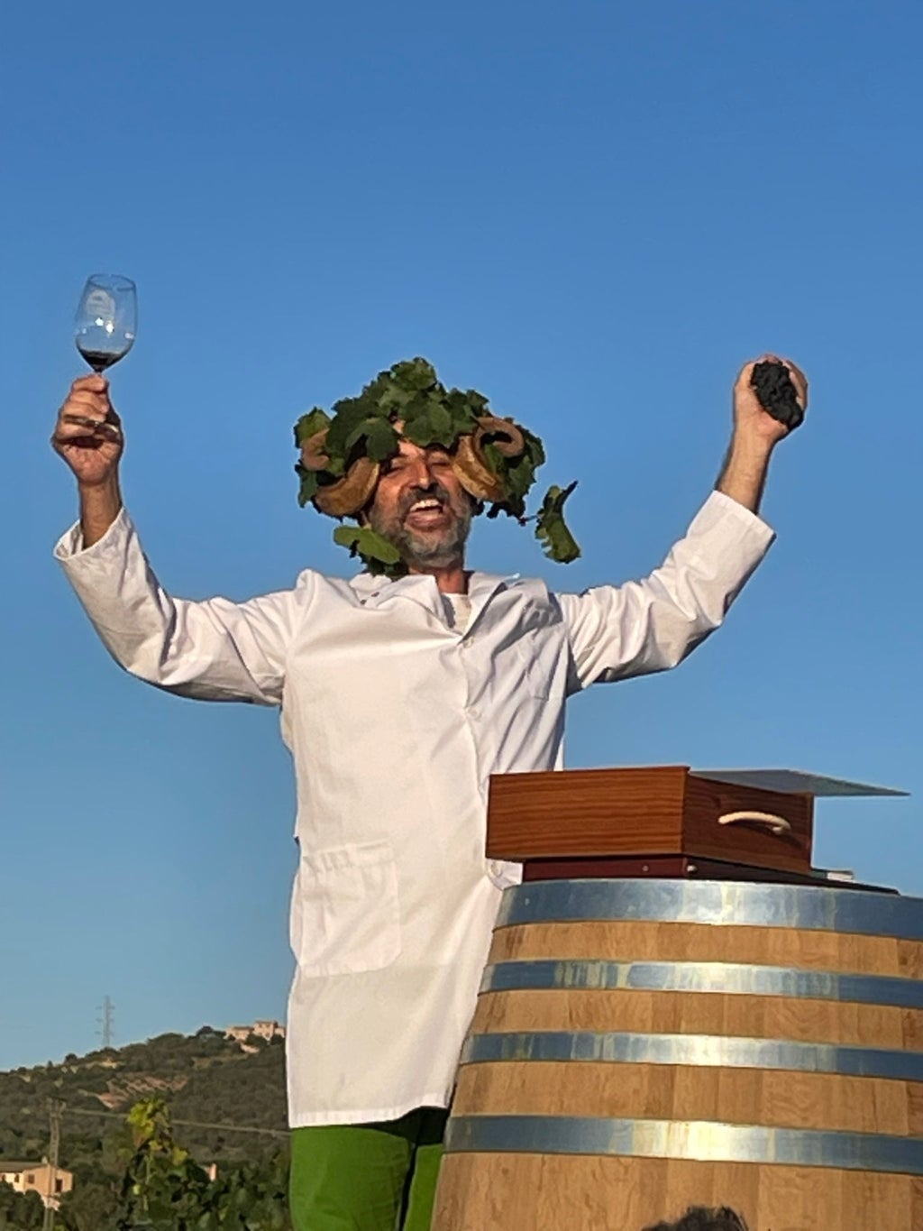 Minuts abans del tall del raïm, l’actor va pujar a un escenari rústec, vestit i amb una mena de capell amb fulles de raïm i banyes d xot, des d’on va recordar el lligam mil·lenari entre Mallorca i el conreu de la vinya i l’elaboració del vi. En el seu estil característic, Gomila va aprofitar per intercalar en el seu parlament referències crítiques i befes relacionades amb la situació actual a l’illa, tot dit des de l’humor més blanc i intel·ligent.