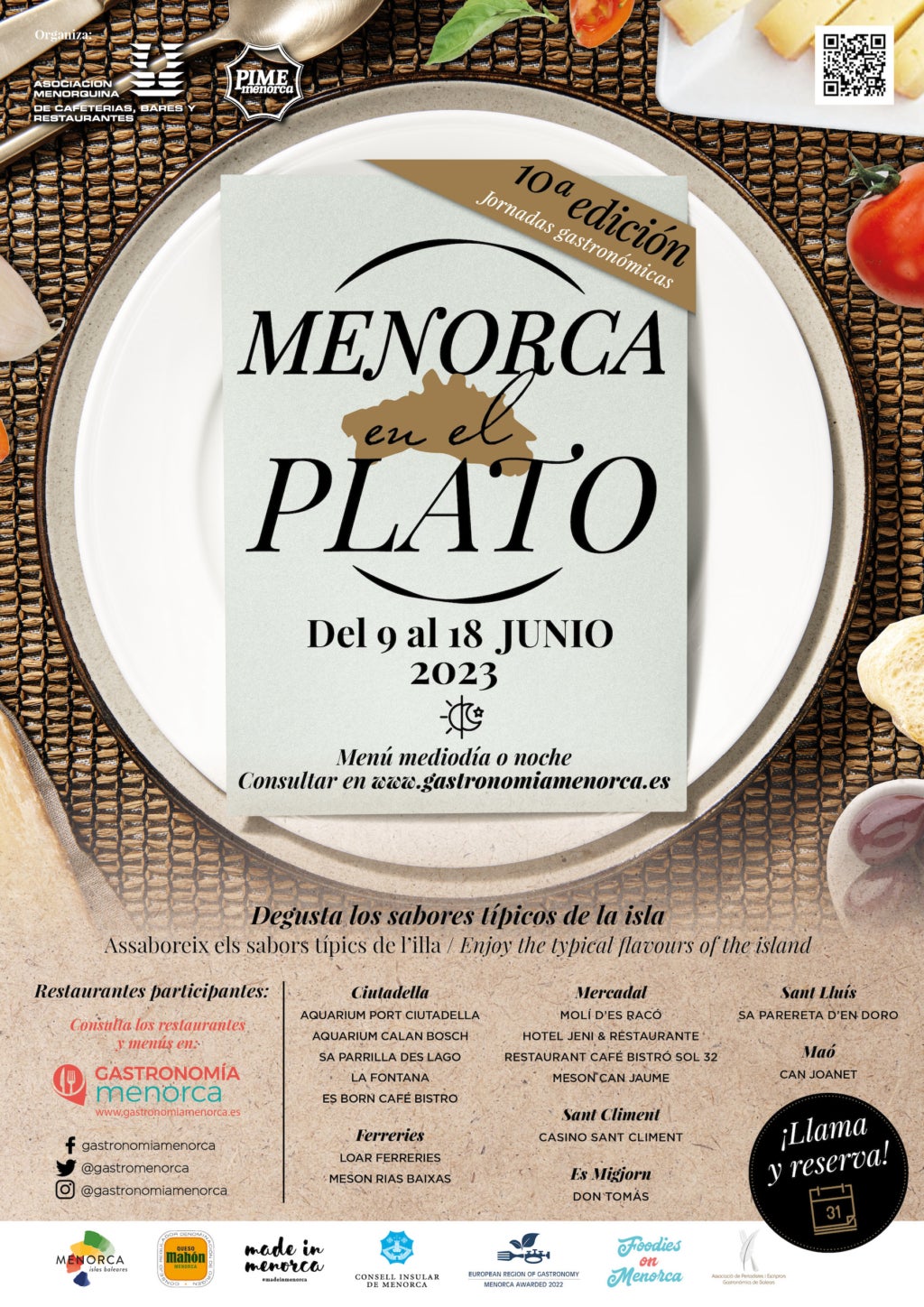 Aquest divendres 9 de juny s’ha donat el tret de sortida a una nova edició, i ja en van deu, de la cita amb la gastronomia menorquina “Menorca al Plat”. Des d’ara i fins diumenge 18 de juny, i al llarg de deu dies consecutius, una quinzena de bars i restaurants oferiran un menú especial de migdia o nit amb l’objectiu de fer valdre la gastronomia típica menorquina i el producte local.