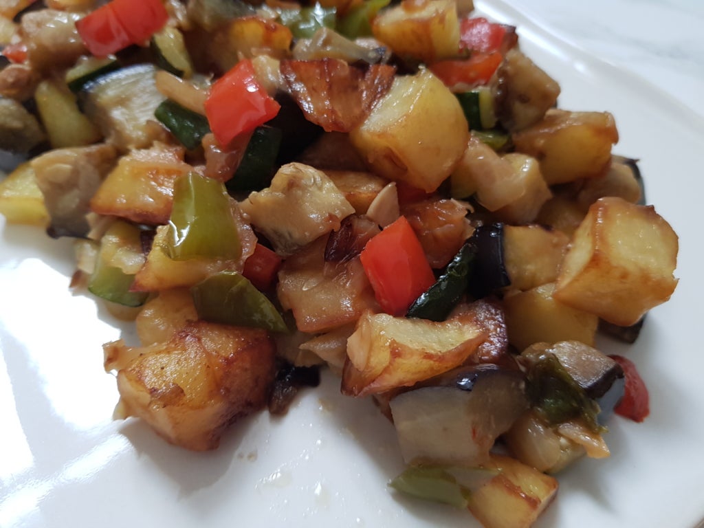 Netegem totes les verdures i les tallem a quadradets. En una paella al foc amb oli fregim les patates amb els grans d’all. Les retirem, llevem un poc d’oli i afegim la ceba. Un cop comenci a posar-se transparent afegim els pebrots, les albergínies i el carabassó i ho deixem fer a poc foc perquè es vagi confitant. Un cop llest afegim les patates, rectifiquem de sal i barregem bé.