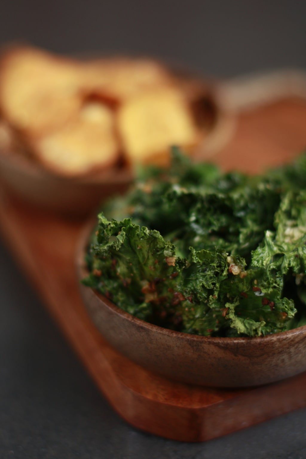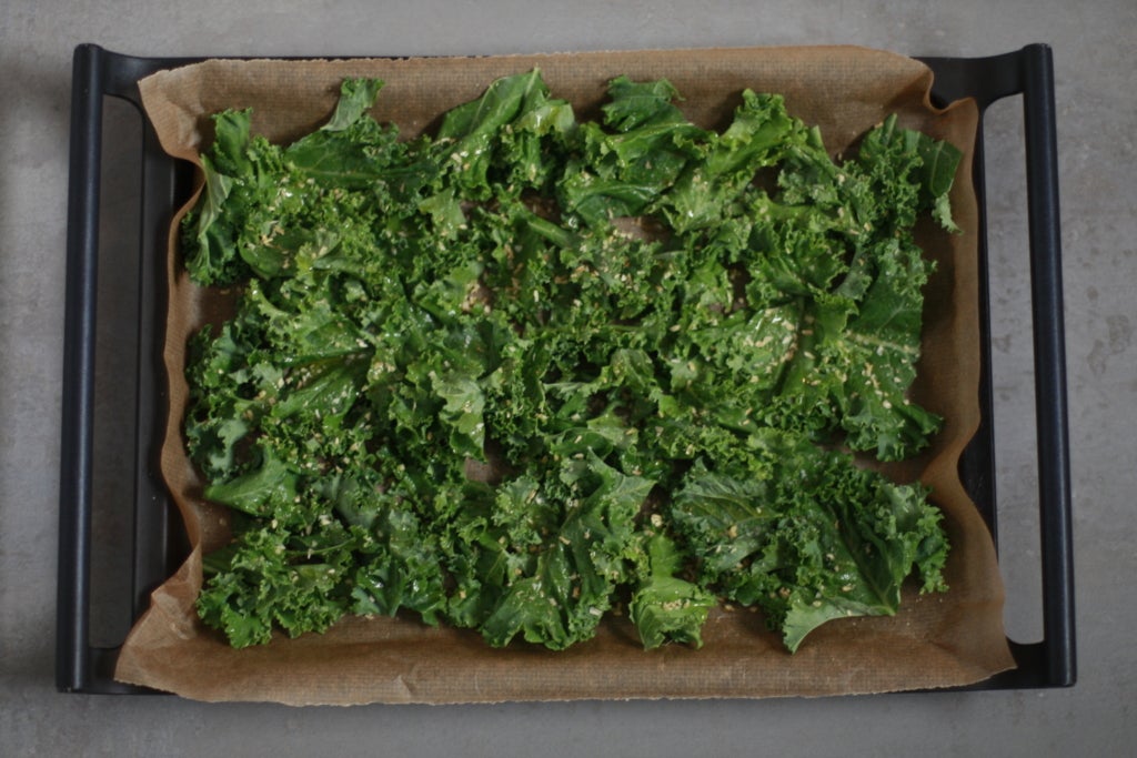 Per preparar els xips de kale, rentem i escorrem bé les fulles, tallem la tija dura del centre i trossegem les fulles. Les estenem sobre una safata del forn coberta amb paper vegetal. Enfornem durant 9 o 10 minuts a forn preescalfat a 180 °C. Abans de servir, empolvorem amb sal, ceba i all.